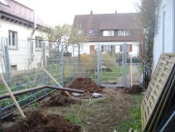 Keine Ahnung warum, aber plötzlich ist da ein Zaun, der 1,8o Meter hoch ist. Er trennt den hinteren Teil des Gartens vom vorderen ab. Da komm ich nicht rüber! Und ich komm auch nicht mehr bis zur Straße vor. Ein paar Mal war ich jetzt schon allein in „meinem Teil“ des Gartens. Ich bin nicht gern allein. Aber ich hatte Zeit, mich genau umzusehen. Ich weiß, jeder glaubt nun, ich würde anfangen zu graben. Aber das ist doch eine zu plumpe Lösung und nur für einen Hund der Muskeln hat aber nichts im Kopf. Kurz: Nichts für mich!
