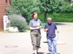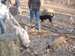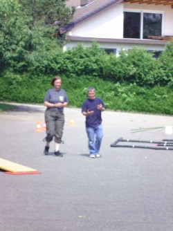 Dann hat Biggi "Hund gespielt". Corinna hat sie an die Leine genommen. Biggi musste die Augen zu machen und wurde mit geschlossenen Augen durch den Parcour geführt. Da merkt Biggi mal, wie wenig man an der Leine ziehen muss, um etwas mitzuteilen! Und das haben wir dann gemeinsam im Parcour geübt.