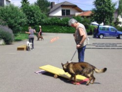 Corinna hat auf dem Schulhof einen Parcour aufgebaut. Da konnte ich zum ersten Mal in meinem Leben über eine Wippe laufen. Biggi sagt, das brauche ich. Beim Zughundewettbewerb muss ich das mit Wagen können! Kleinigkeit - beim Üben hier hatte ich gar keine Probleme.